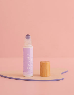 CALMA - Amatista + Aceites esenciales de lavanda, mejorana, geranio, manzanilla, pachulí y mandarina; diluídos en aceite de coco. Te ayuda a relajar mente y cuerpo; disminuyendo la tensión, ansiedad y angustia. Promueve la relajación y el bienestar, te ayuda a dormir tranquilo.