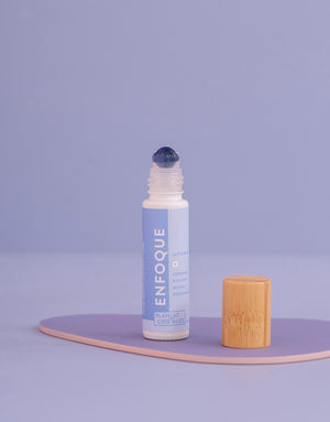 ENFOQUE - Lapizlázuli + Aceites esenciales de limón, romero, menta, anís, toronja, bergamota, palmarosa, enebro, albahaca, may chang; diluídos en aceite de coco. Te ayuda a mantener concentrado, mentalemente activo, motivado y creativo.