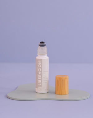 LIBERACIÓN - Obsidiana + Aceites esenciales de menta, lavanda, albahaca, canela, eucalipto, romero, ravensara, jengibre, manzanilla; diluídos en aceite de coco. Te ayuda a soltar la tensión acumulada en cuerpo y mente. Promueve la armonía y el balance y te ayuda a mantener centrado.
