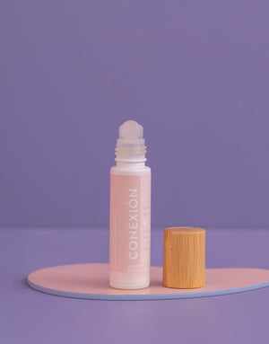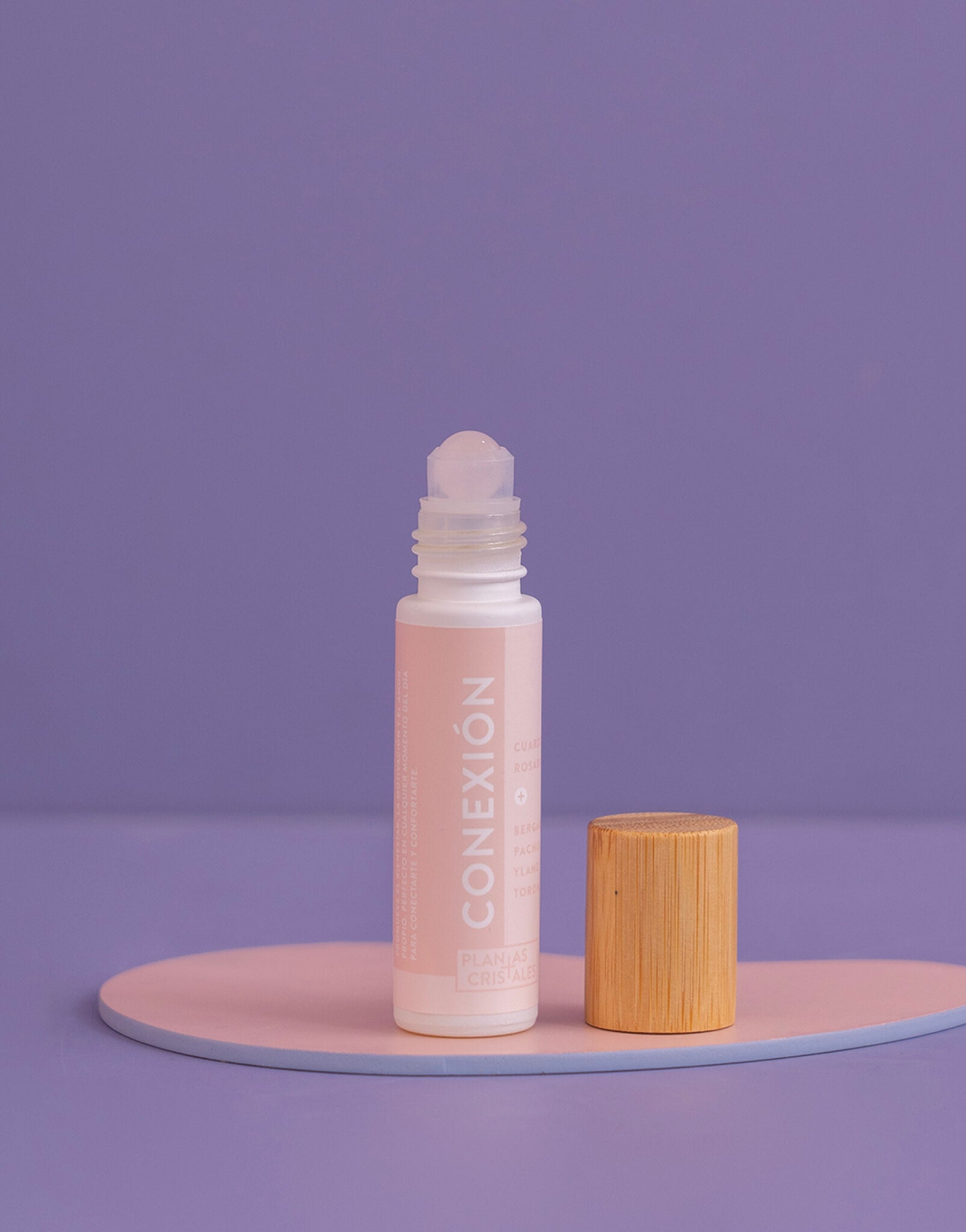 CONEXIÓN - Cuarzo Rosado + Aceites esenciales de bergamota, pachuí, naranja, ylang ylang y toronja; diluídos en aceite de coco. Te ayuda a mantener balanceado. Promueve el bienestar, la motivación y el amor propio.