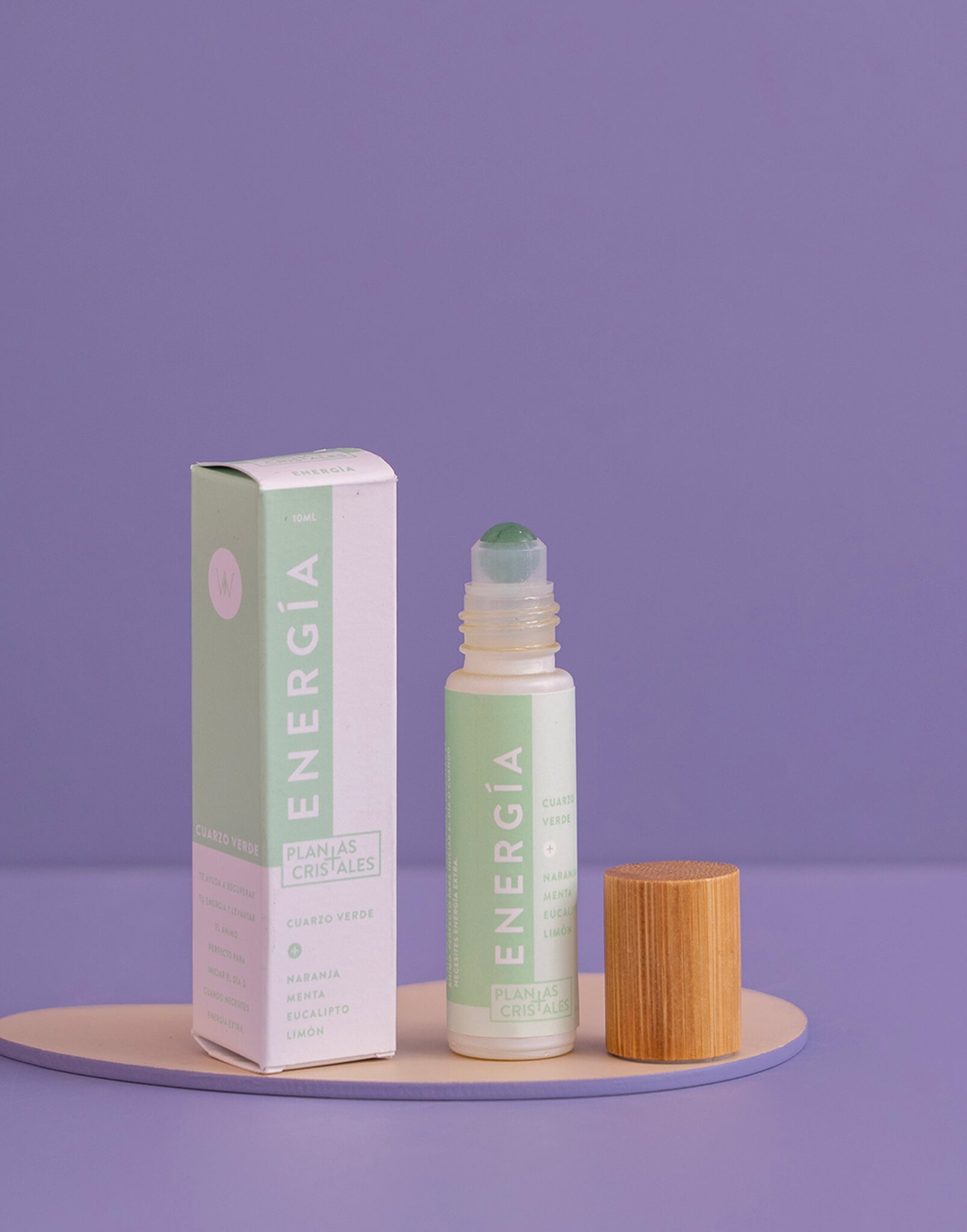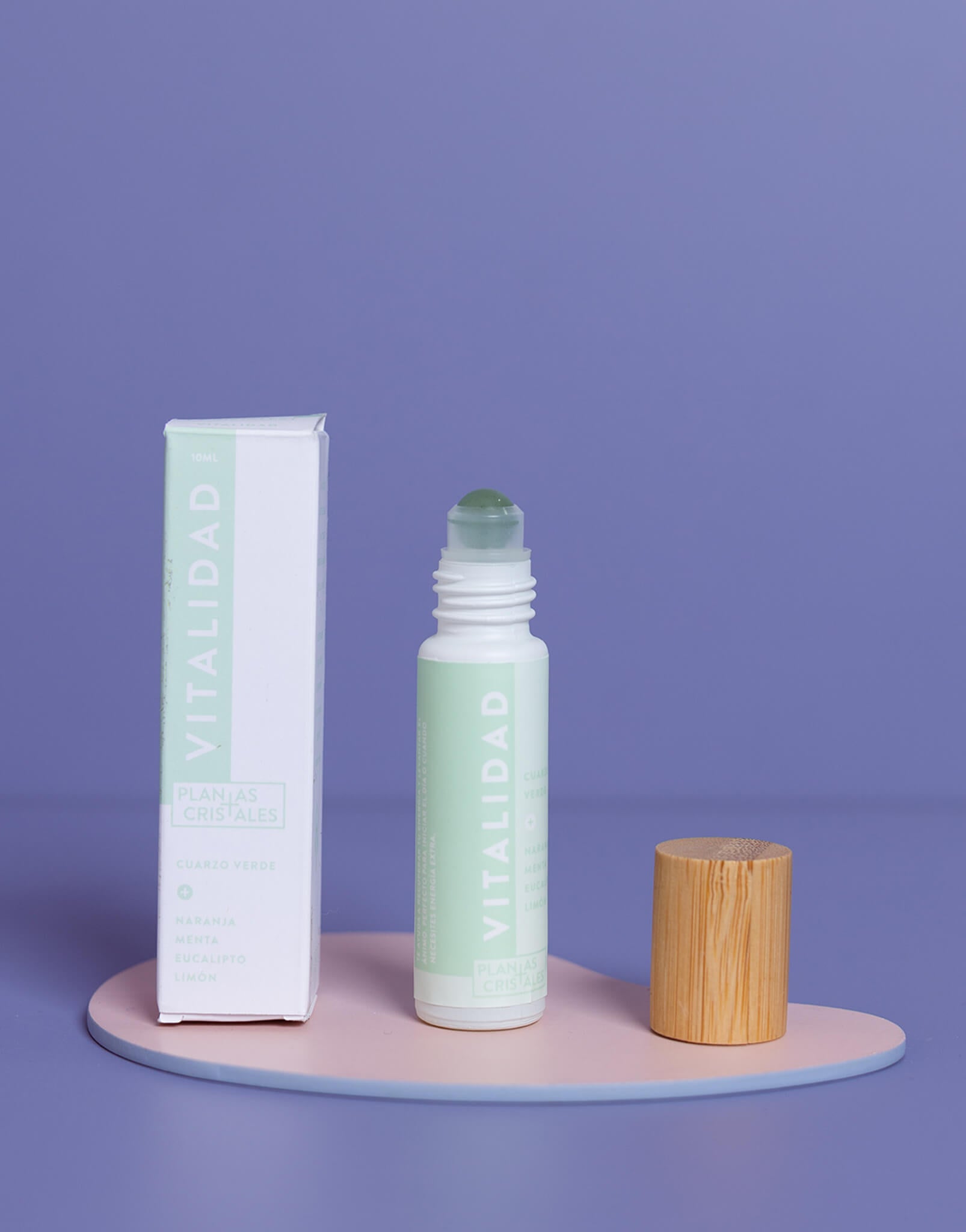 VITALIDAD - Cuarzo Verde + Aceite esenciales de naranja, menta, eucalipto, limón, jengibre, geranio; diluídos en aceite de coco. Tiene un poder revitalizante para ayudarte a recuperar y reforzar tu energía. Levanta el ánimo y la autoconfianza. Promueve la vitalidad.