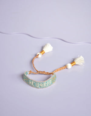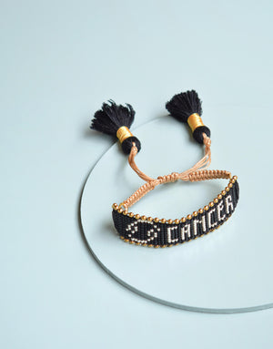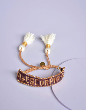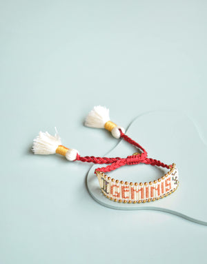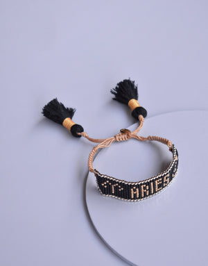 Pulsera hecha a mano en Colombia, inspirada en los signos del zodíaco con chaquiras de Miyuki y borlas colgando a los extremos.