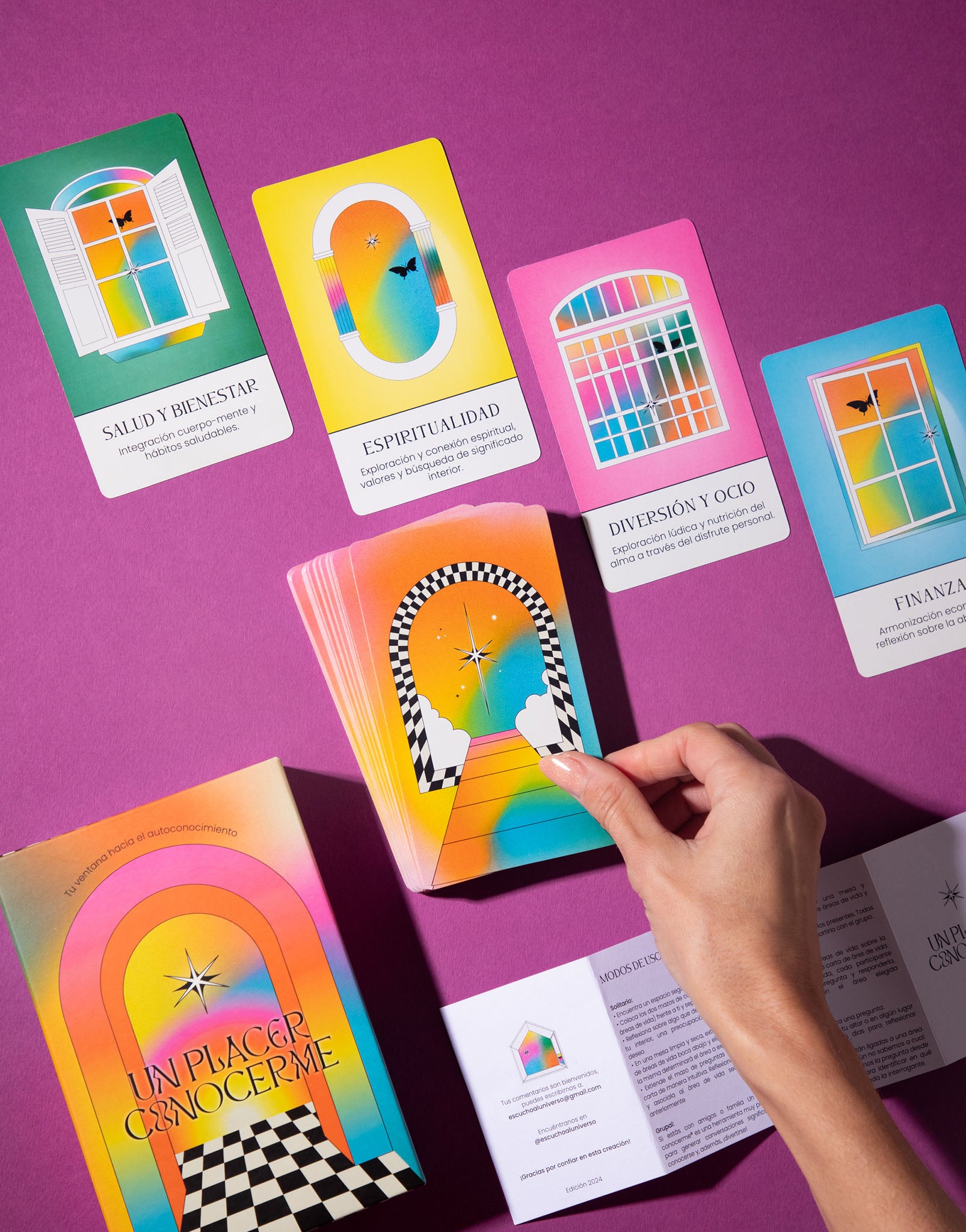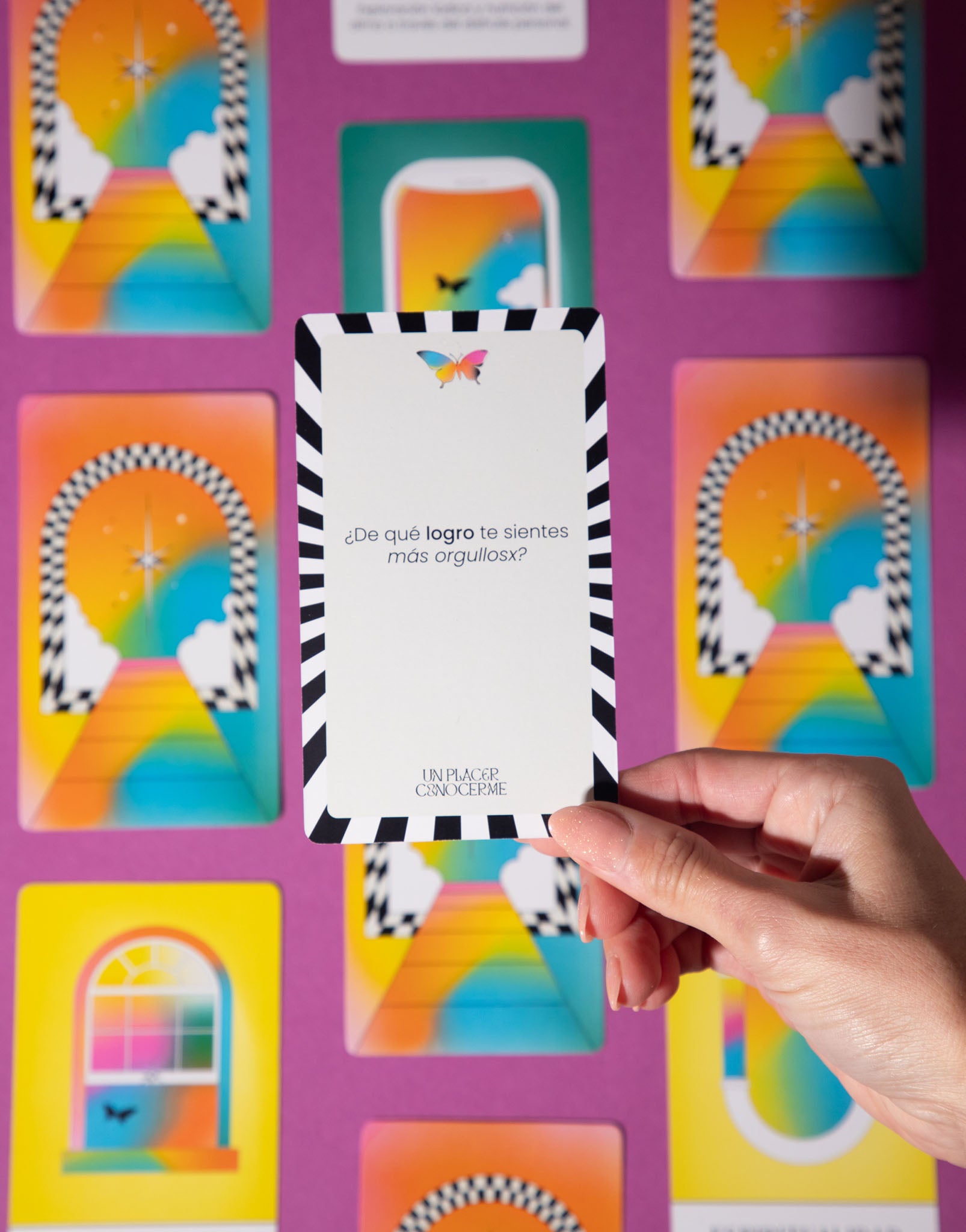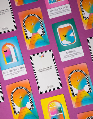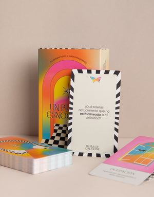 Cuenta con 51 cartas con preguntas abiertas y 9 cartas de áreas de vida destinadas a dirigir y enriquecer las respuestas.