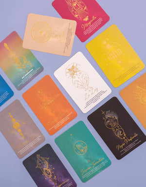 En el capítulo violeta del libro encontrarás el Oráculo de los Colores, 57 cartas inspiradas por la Fuerza Multicolor, que contiene cada una un color, un mensaje y una ilustración con símbolos, geometría sagrada, animales de protección, plantas y figuras con múltiples significados.