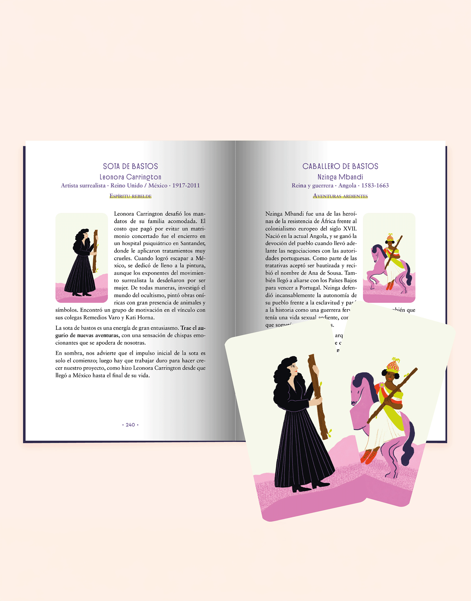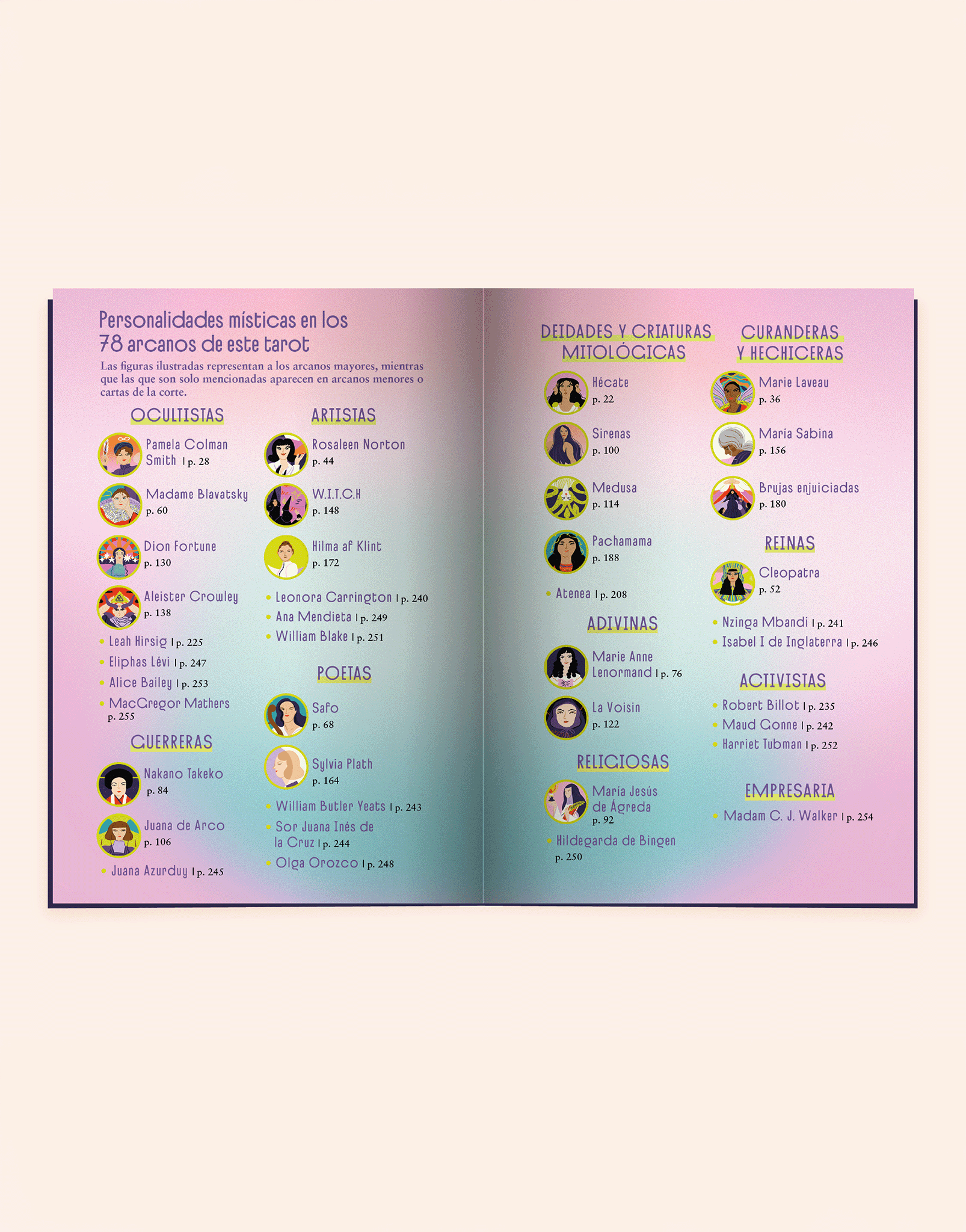 Sylvia Plath (La Luna) demoniza el vínculo con su madre; Safo (El Enamorado) dice que el amor es –también– amargo; Dion Fortune (La Templanza) va a la guerra con un batallón de meditadores; Marie Anne Lenormand (El Carro) pasa de ser una niña huérfana a la adivina de la élite francesa.
