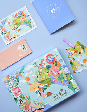 - Una postal con la ilustración de viaje para que hagas uno de los retos que te proponemos en el tiquete o se lo regales con un mensaje lindo a alguien importante para ti.