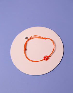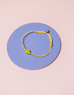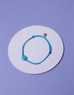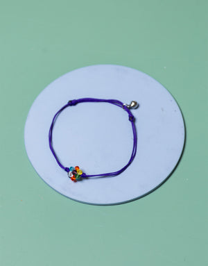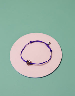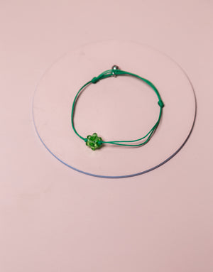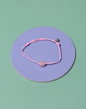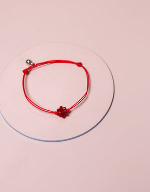 Manilla con hexaedro tejido a mano en rondelas de cristal y llamador de ángeles de acero. La manilla es en hilo y es ajustable a varios tamaños.