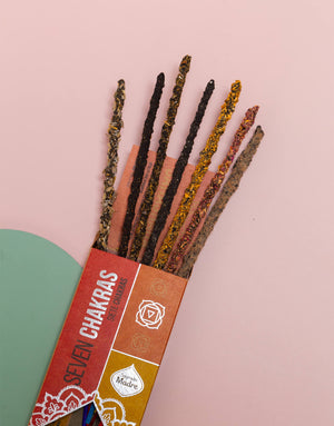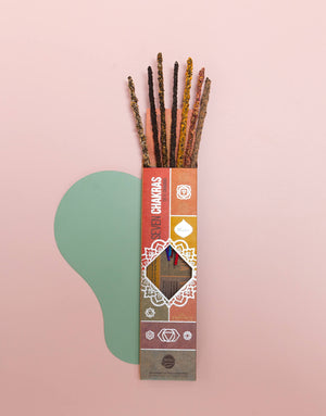 Chakra Corona: Sándalo Chakra Tercer Ojo: Lavanda Chakra Garganta: Copal Chakra Corazón: Romero Chakra Plexo Solar: Palo Santo Chakra Sacro: Mirra Chakra Raíz: Rosas
